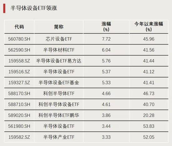 半导体设备引领今日市场行情,科创半导体材料设备指数收报1952.53点,创下近四年新高,多只半导体设备、科创半导体ETF涨超4%。